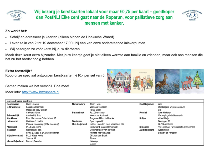 Ieder jaar verzorgt Hoeksche Waard Runners de kerstpost in de Hoeksche Waard. Toegewijde vrijwilligers brengen in de periode voor de kerst uw post netjes en verzorgt aan het gewenste adres.